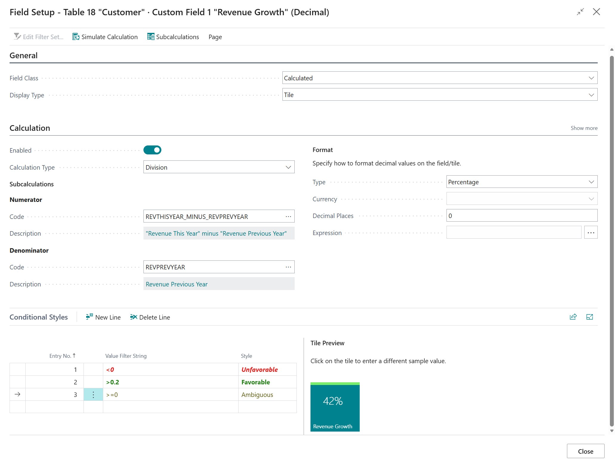 However, you can make calculated fields visible on the Custom Tiles factbox as FactBox Field or Tile for the selected record on the list page. For this, change the Display Type of the calculated field to FactBox Field, Tile or Page Field and Tile.