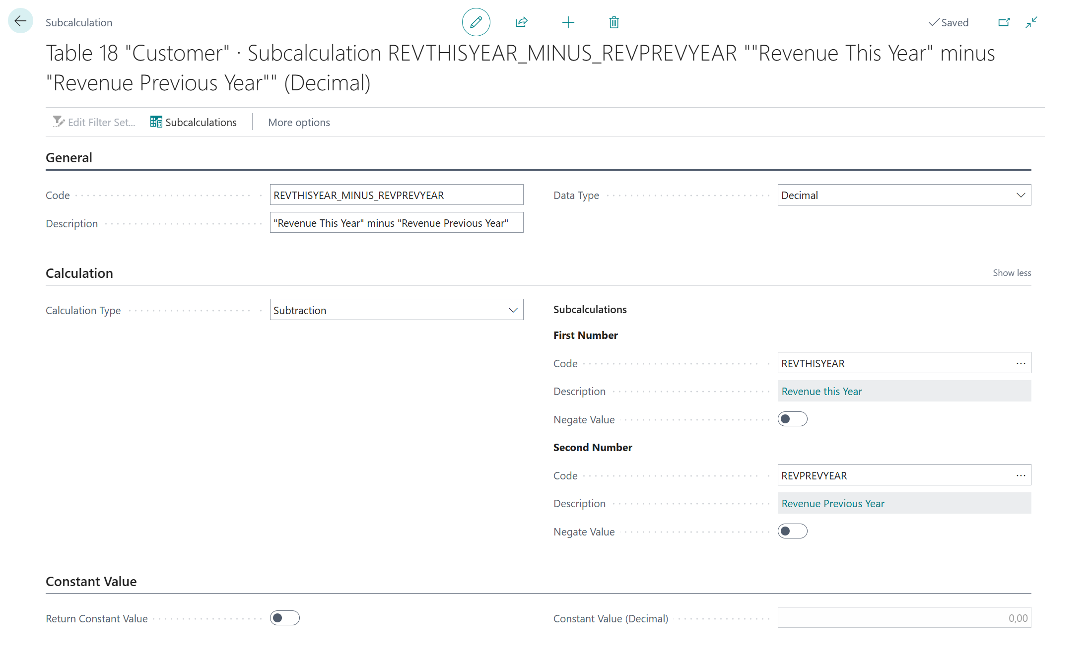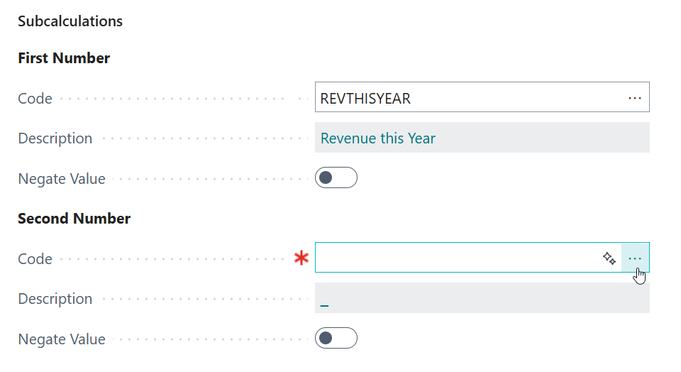 \[ \text{“Revenue This Year”} - \text{“Revenue Previous Year”} \]On the Numerator - Code page field, click on the Assist-Edit () button to set up the subcalculation to use.