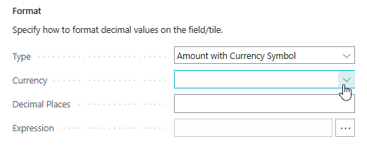 Amount with Currency Symbol | The decimal field is formatted with a currency symbol. The currency symbol that is used is that of the Local Currency defined in the General Ledger Setup. The decimal places/points are taken from the Amount Decimal Places (LCY) setting in the General Ledger Setup. It is possible to override the Currency and/or Decimal Places that will be used for the formatting of the field. |