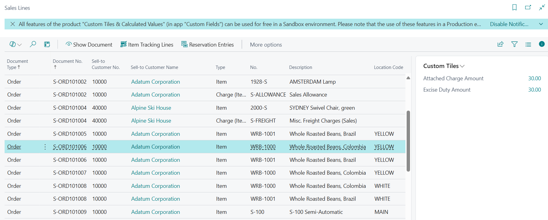 For example, you can define custom calculated fields for the Sales Line entity and view the calculation results in the Custom Tiles factbox on the Sales Lines list page:
