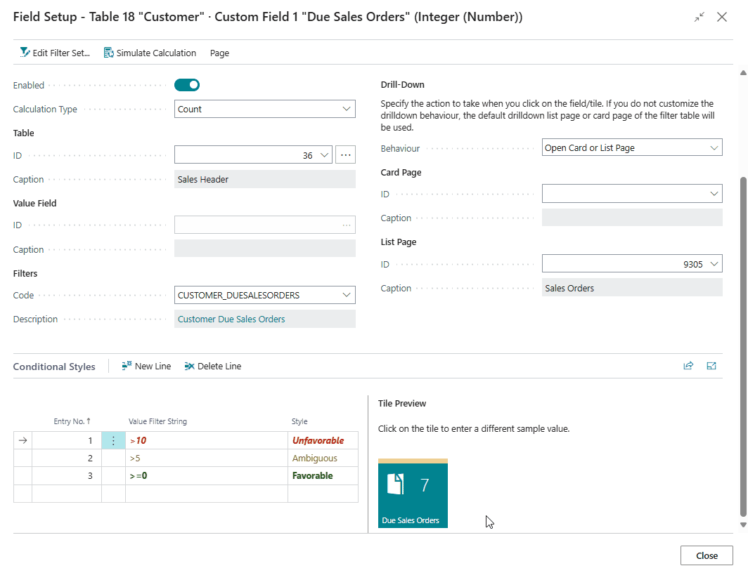 Tile | The custom field is shown in the Custom Tiles factbox as a tile/cue. Only supported for Decimal and Integer fields. |